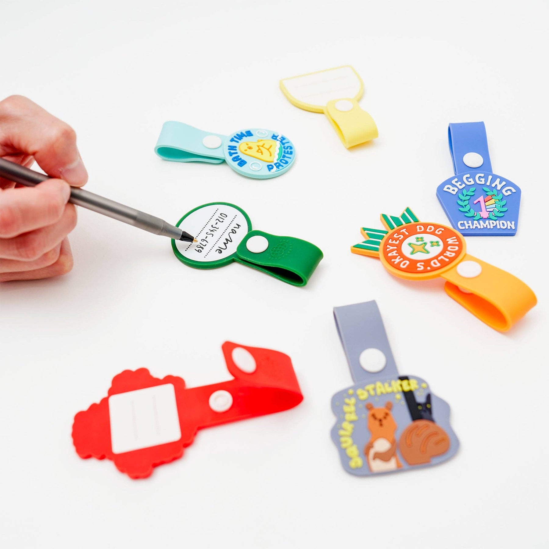 Each tag has a space on the back for your furry friend's name and contact details.