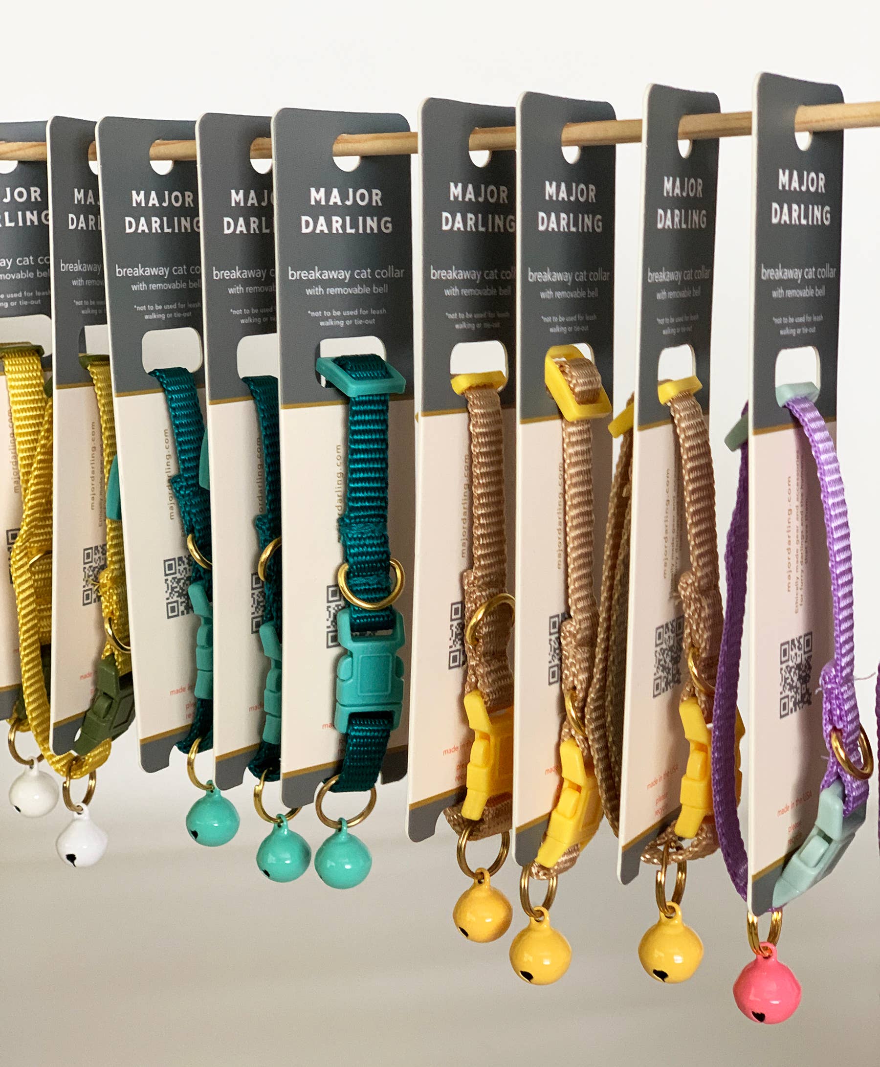 Lightweight 3/8" webbing and a nylon buckle with a breakaway safety feature, plus a removable bell and a brass D-ring to attach ID tags. Packaged on sturdy cardstock for easy display.