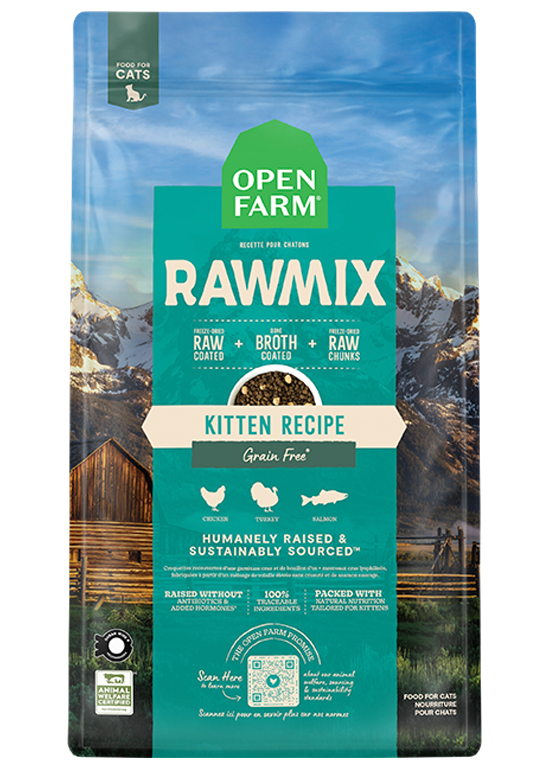 RawMix features our protein-packed kibble covered in a nutritious bone broth and freeze dried raw coating, with added chunks of freeze dried raw. Crafted with a blend of 100% animal welfare certified chicken, turkey, and wild-caught salmon, this irresistible recipe includes nutrient-dense meat, organ, and bone with no grains or any byproducts. This recipe is packed with natural nutrition tailored for kittens including natural DHA to support health brain and eye development.